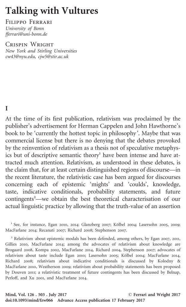 This is a critical review of “Relative Truth”, a collection of essays on relativism about truth edited by Manuel García-Carpintero and Max Kölbel, and published by Oxford University Press.